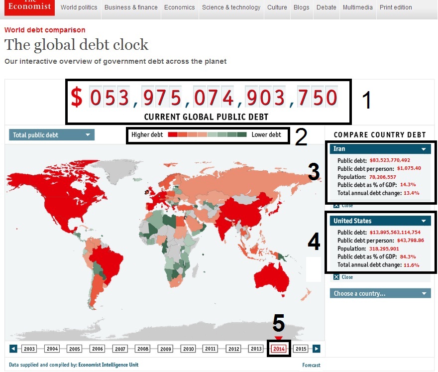 شماره 1: در این بخش شما با مجموع بدهی های دولت های جهان روبرو هستید که هم اکنون عددی در حدود 53 هزار میلیارد دلار را نشان می دهد. این عدد با توجه ربوی بودن نظام اقتصادی حاکم بر جهان با گذر زمان افزایش می یابد و در صورتی که به این سایت مراجعه کنید می بینید که هر چند ثانیه عدد فوق بروز می گردد.